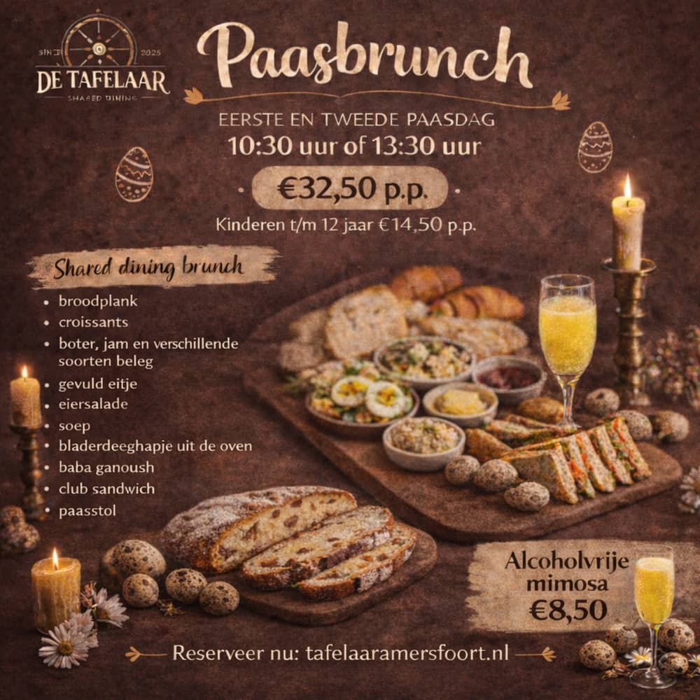 Vier Pasen met een gezellige paasbrunch bij De Tafelaar in het centrum van Amersfoort. Op 5 en 6 april serveren we een uitgebreide shared dining brunch met verschillende gerechten om samen te delen. Of je nu komt met familie, vrienden of kinderen: Pasen is het perfecte moment om samen aan tafel te zitten en rustig te genieten van goed eten. Tijdens onze paasbrunch serveren we een selectie van brunchgerechten die perfect passen bij Pasen. Denk aan vers brood, croissants, hartige hapjes uit de oven, ei-gerechten en verschillende kleine gerechten om samen te delen. De brunch wordt geserveerd als shared dining lunch, zodat iedereen verschillende smaken kan proeven. Een paasbrunch in Amersfoort centrum is het perfecte uitje voor het hele gezin. De Tafelaar ligt in het centrum van Amersfoort aan de Kamp, een gezellige plek om Pasen te vieren met familie en vrienden. Of je nu op zoek bent naar een paasbrunch restaurant in Amersfoort of pasen uit eten wilt in Amersfoort, bij ons ben je van harte welkom. PAASBRUNCH MENU Shared dining brunch met: • Plank met brood • Croissants • Boter • Jam • Verschillende soorten beleg • Gevuld eitje van De Tafelaar • Eiersalade • Soep • Bladerdeeghapje uit de oven • Baba ganoush • Club sandwich DRANKEN Tijdens de brunch kun je onder andere genieten van: • (Alcoholvrije) mimosa – €8,50 Daarnaast zijn koffie, thee en andere drankjes beschikbaar van de kaart. PRAKTISCHE INFORMATIE 📅 Datum: 5 en 6 april 2026 💰 Prijs: €32,50 per persoon 👶 Kinderen tot en met 12 jaar: €14,50 📍 Locatie: De Tafelaar, Kamp 8, Amersfoort Wil je Pasen vieren met een gezellige brunch in Amersfoort? Reserveer op tijd een tafel voor onze paasbrunch bij De Tafelaar. VEELGESTELDE VRAGEN Moet ik reserveren voor de paasbrunch? Ja, reserveren wordt aanbevolen omdat het aantal plaatsen beperkt is. Is de paasbrunch geschikt voor kinderen? Ja, kinderen zijn welkom en er geldt een speciaal tarief voor kinderen tot en met 12 jaar. Wat voor soort brunch serveren jullie? We serveren een shared dining brunch met verschillende kleine gerechten om samen te delen. Waar ligt De Tafelaar? De Tafelaar ligt in het centrum van Amersfoort aan de Kamp.